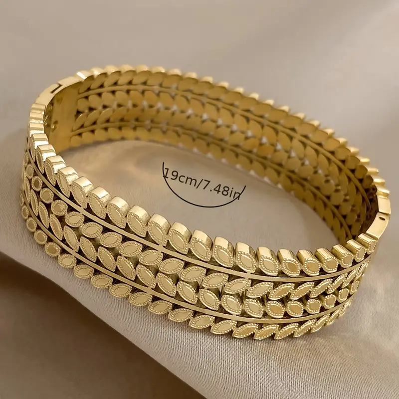 Bohemian Leaf Wide-Opening Stainless Steel Bracelet – Light Luxury Electroplated Cuff for Women